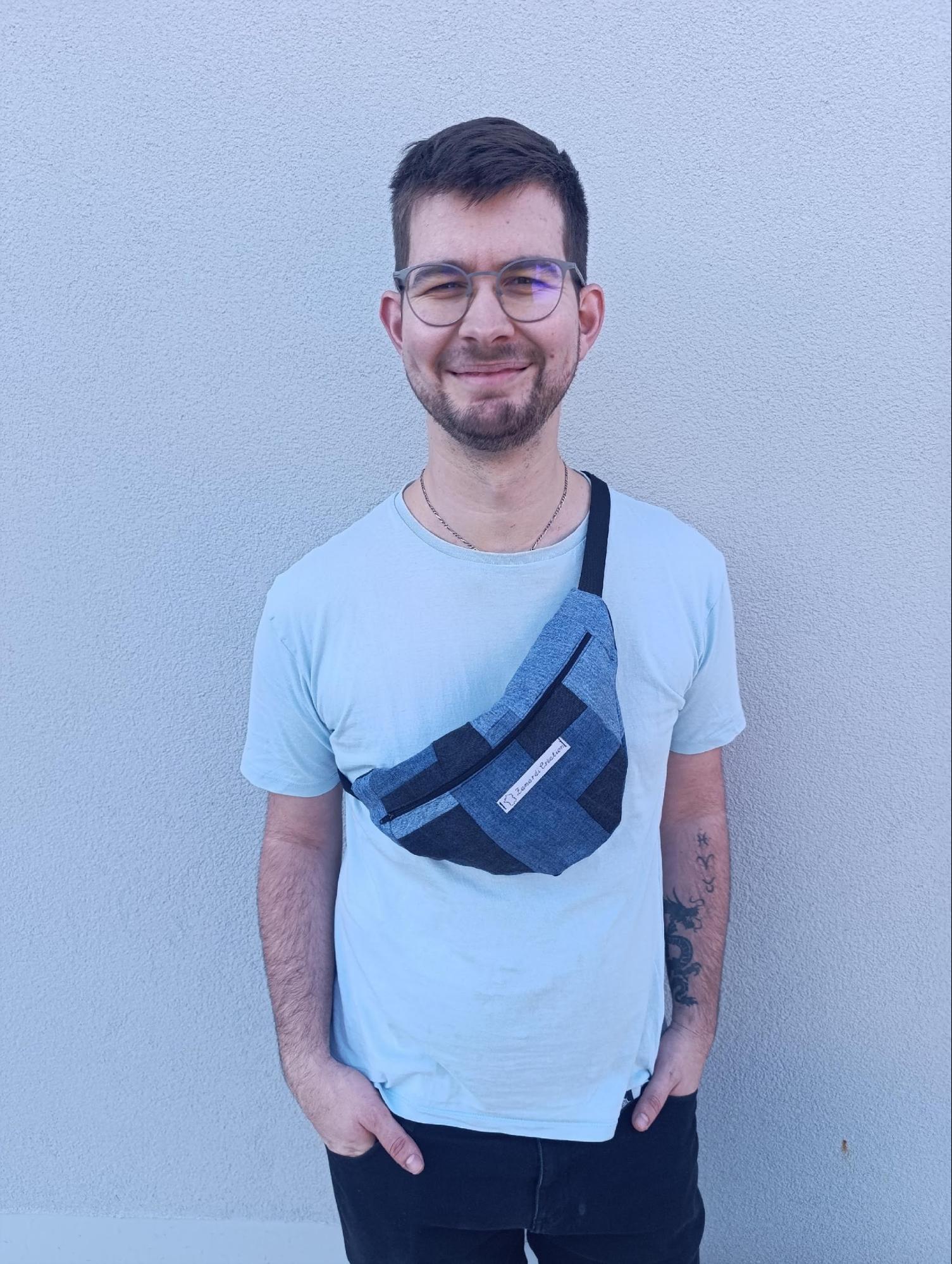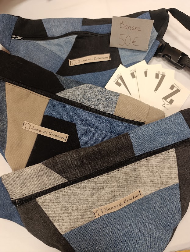 Banane en patchwork de jeans recyclé, sangle réglable. Doublure : Cretonne 100% coto