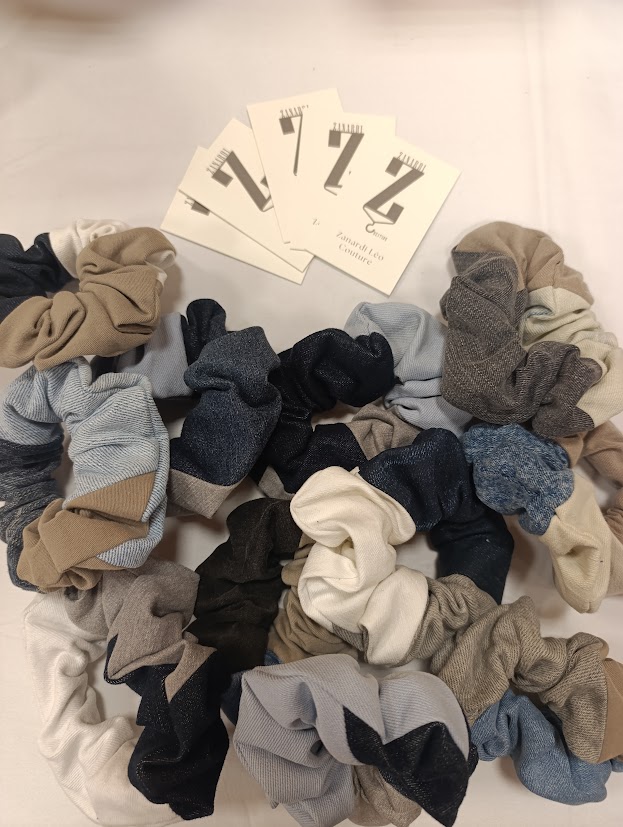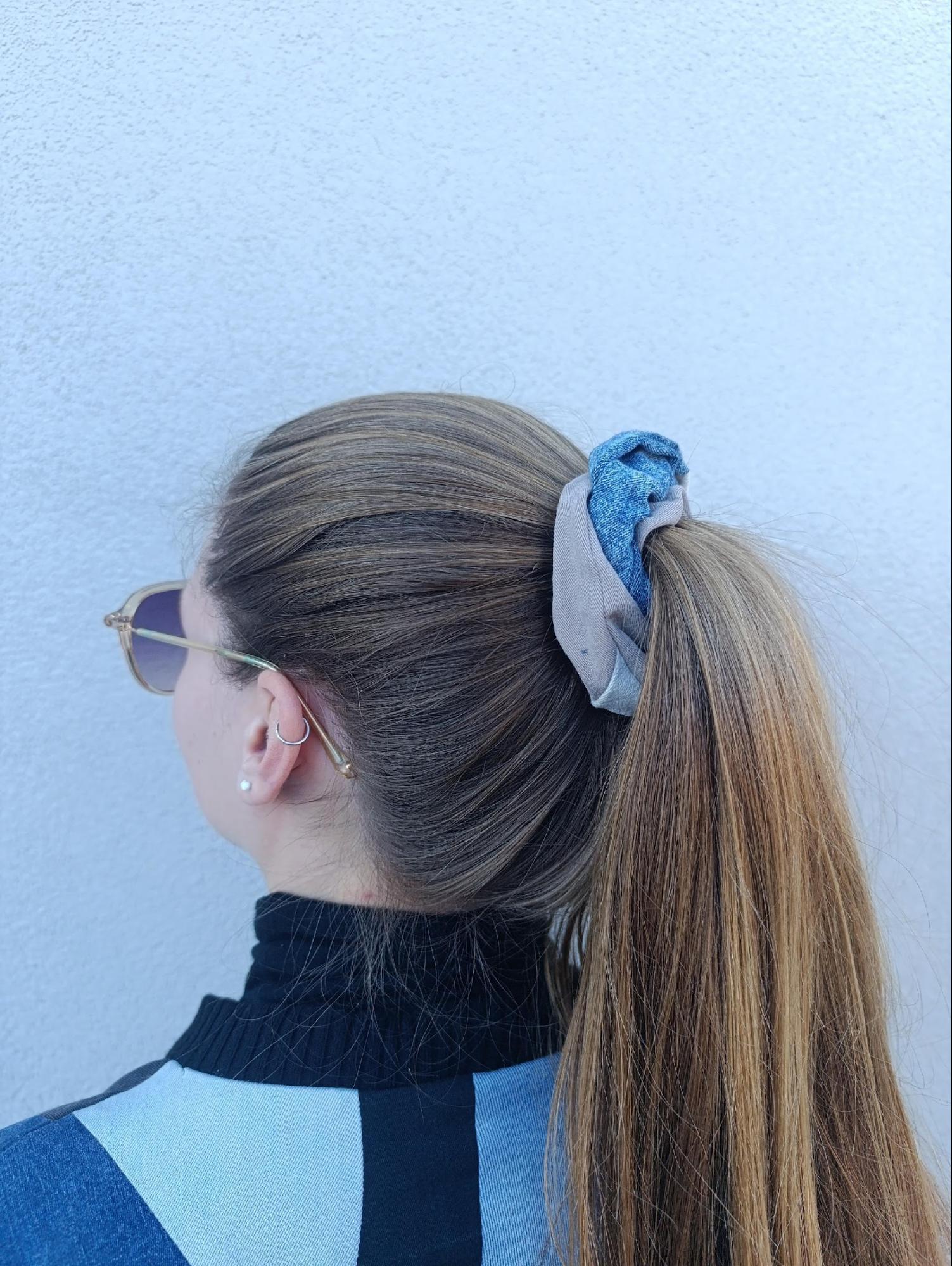 Chouchou en patchwork de jeans recyclé. Elastique 20cm