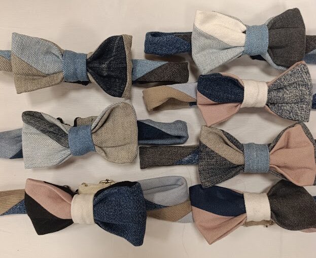 Nœud Papillon en patchwork de jeans recyclé. Tour de cou réglable.